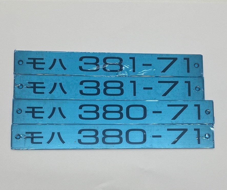 E005編成の、クモハ381-507・クロ381-141の字幕とクモハ381-507・モハ380-66・サハ381-231・クロ381-141の車内車号銘板とH001編成のモハ381-71・モハ380-71の車内車号銘板です。
