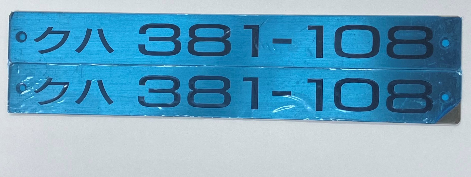 J002編成の、クハ381-108の前面字幕と側面字幕クハ381-108の車内車号銘板です。
