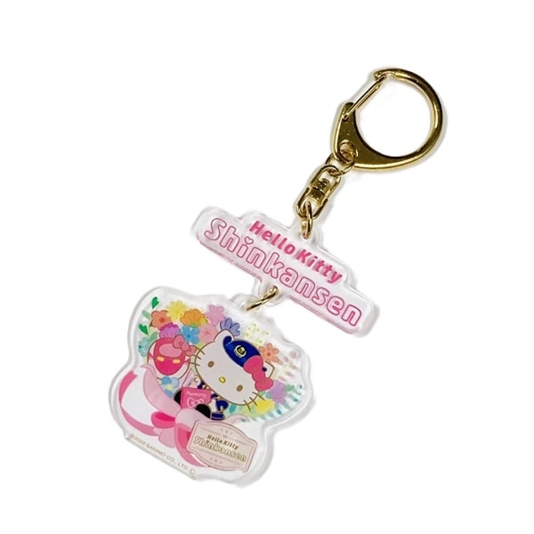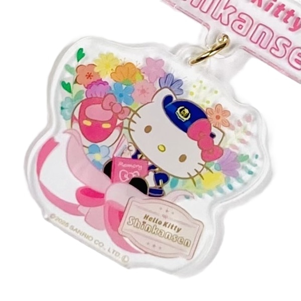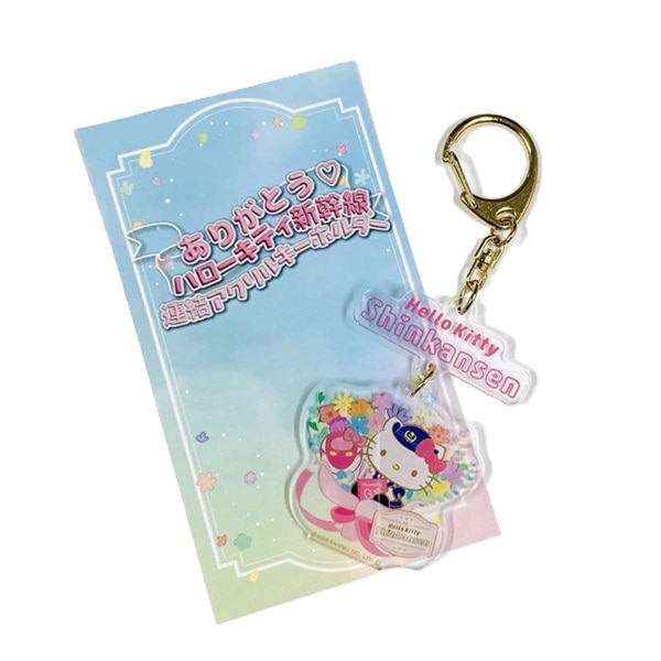 「ハローキティ新幹線のロゴ」とブーケに包まれたハローキティの連結タイプのキーホルダーです。「ありがとう」の気持ちを込めた特別なイラストです。