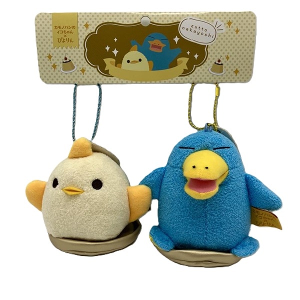 イコちゃんとぴよりんが手と羽をつないで愛らしく並んだ、ケーキトレーにのったスイーツのような可愛いマスコットセットです。