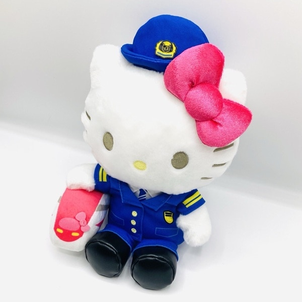 制服を着たハローキティと新幹線がセットになったぬいぐるみです。