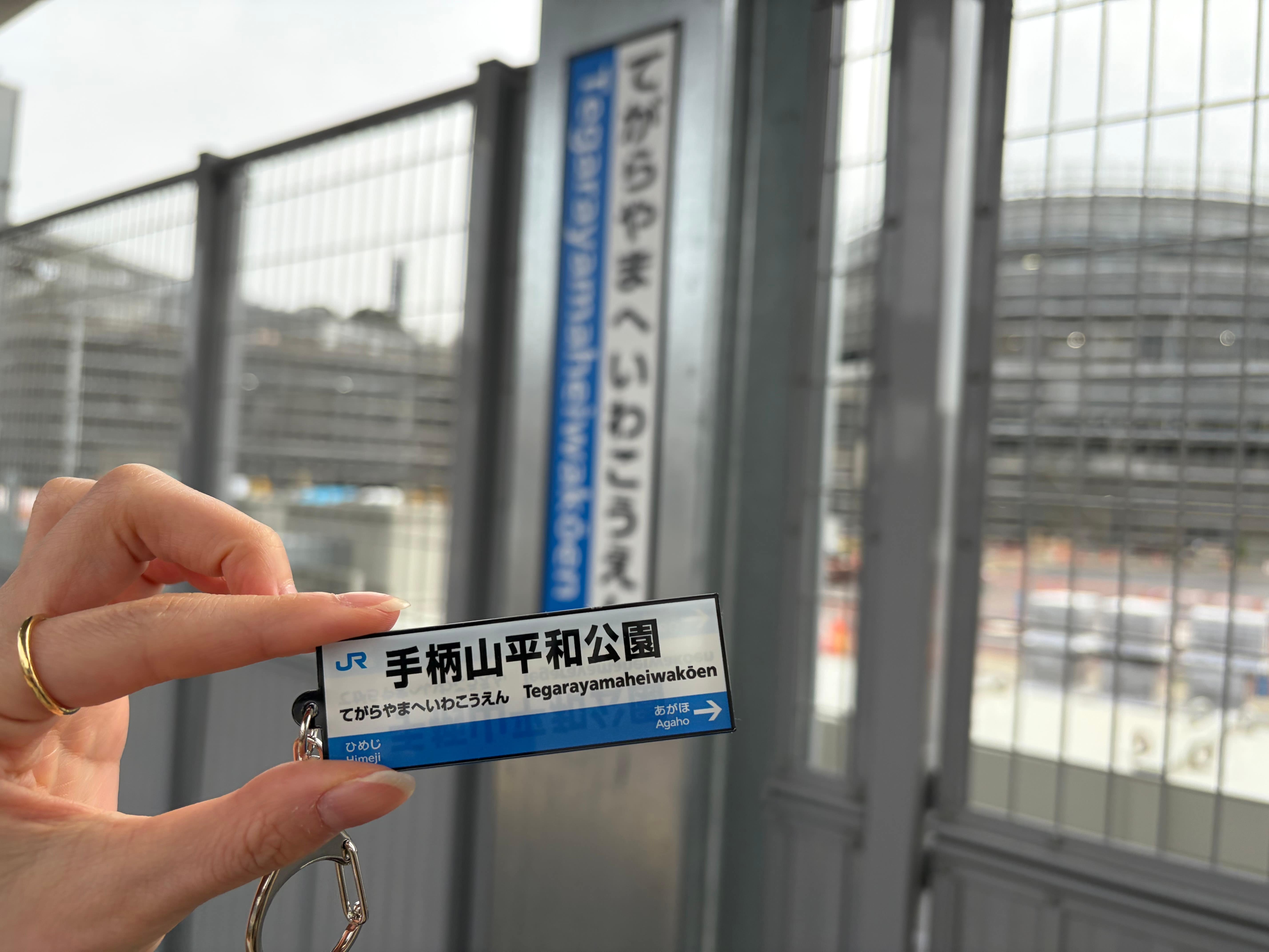 2026年3月に山陽本線に開業する「手柄山平和公園駅」の駅名標をデザインしたキーホルダーです。