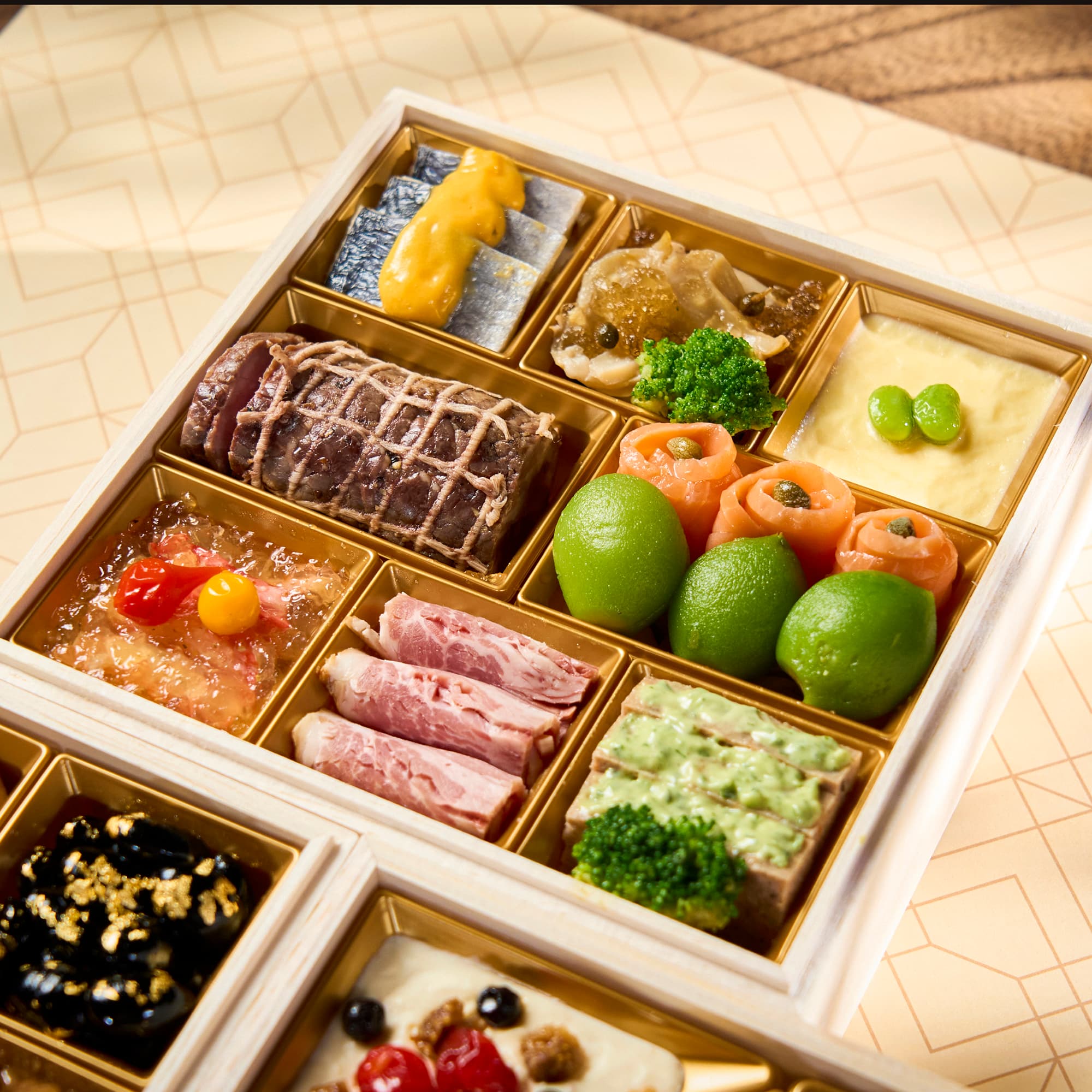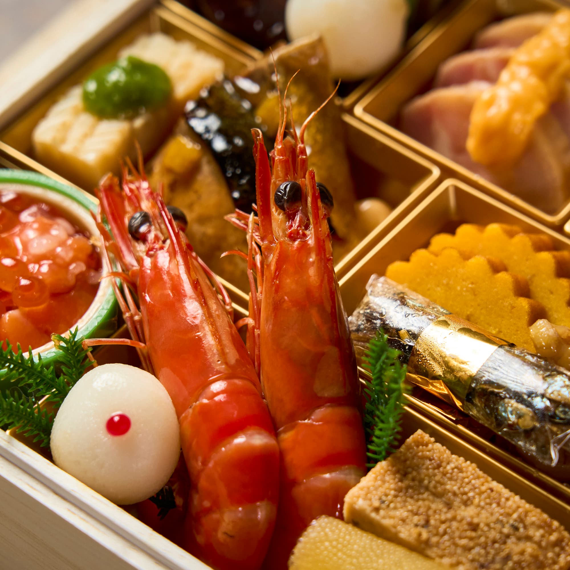 鰤照焼、大豆やわらか煮、伊達巻柚子風味、田作りカシューナッツ和え、くるみ甘露煮、鮭ルイベ漬いくら掛け、