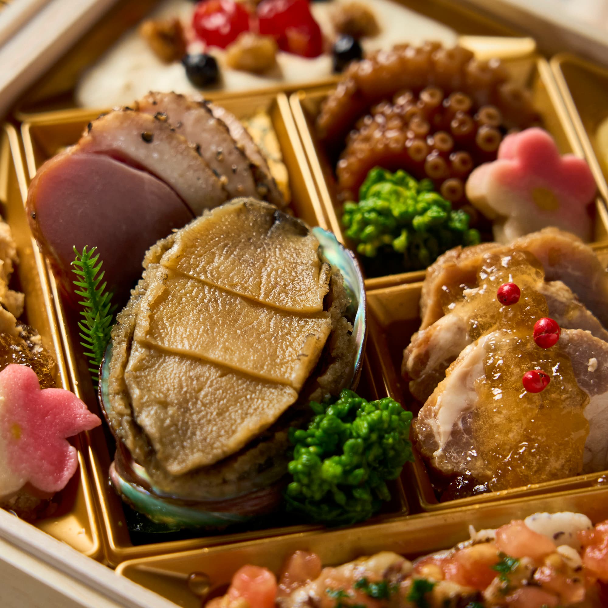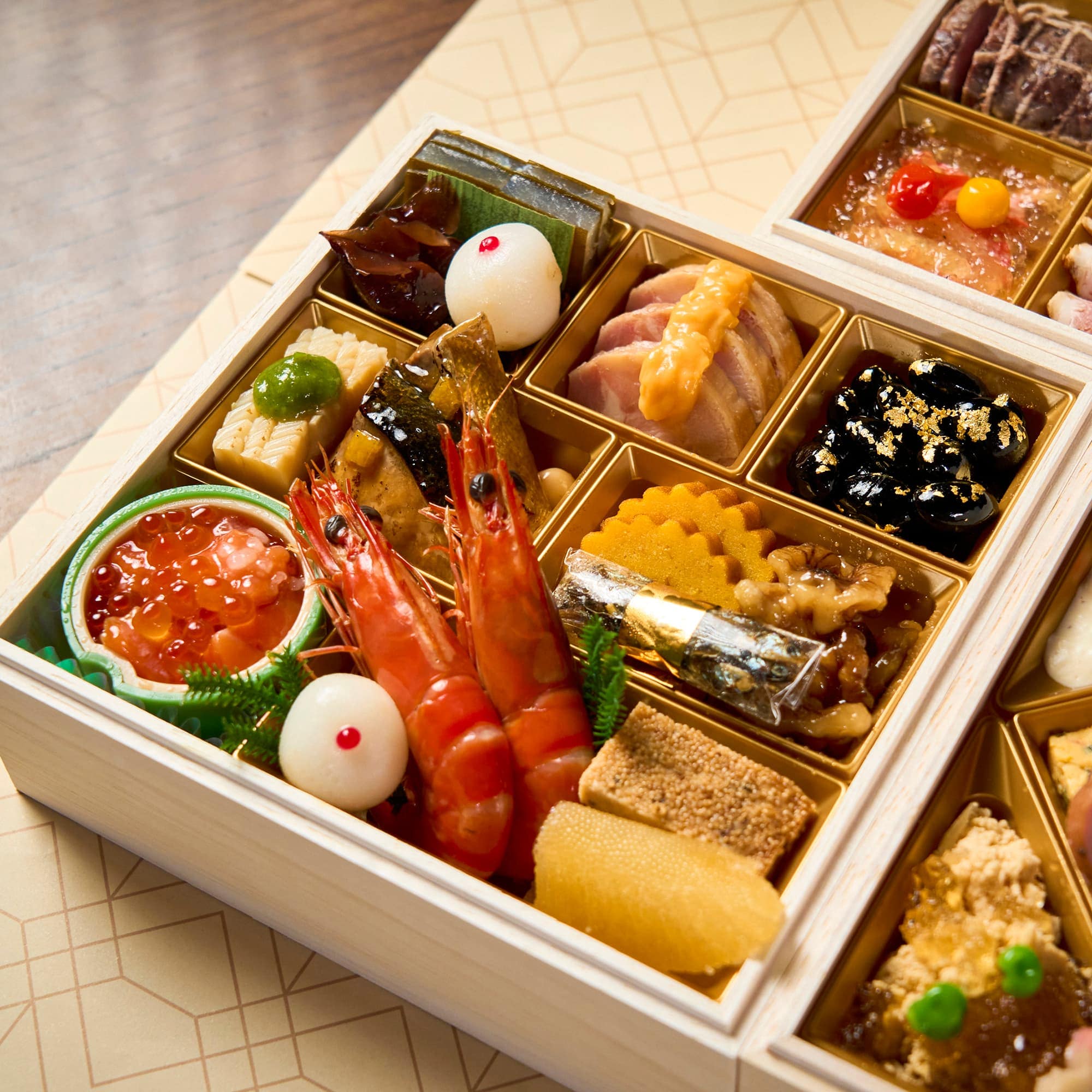 海老旨煮、トリュフ入りレーズン松風、数の子醤油漬