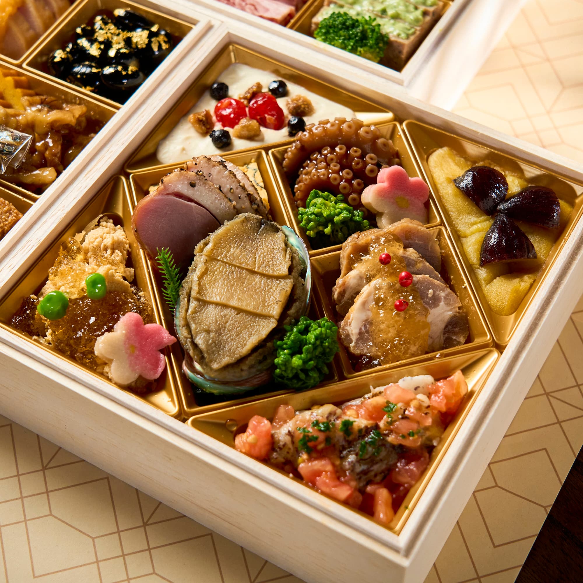 いちじく入りクリームチーズ、五郎島金時の渋皮栗きんとん、蛸やわらか煮、椎茸旨煮、味付菜の花、梅麩、