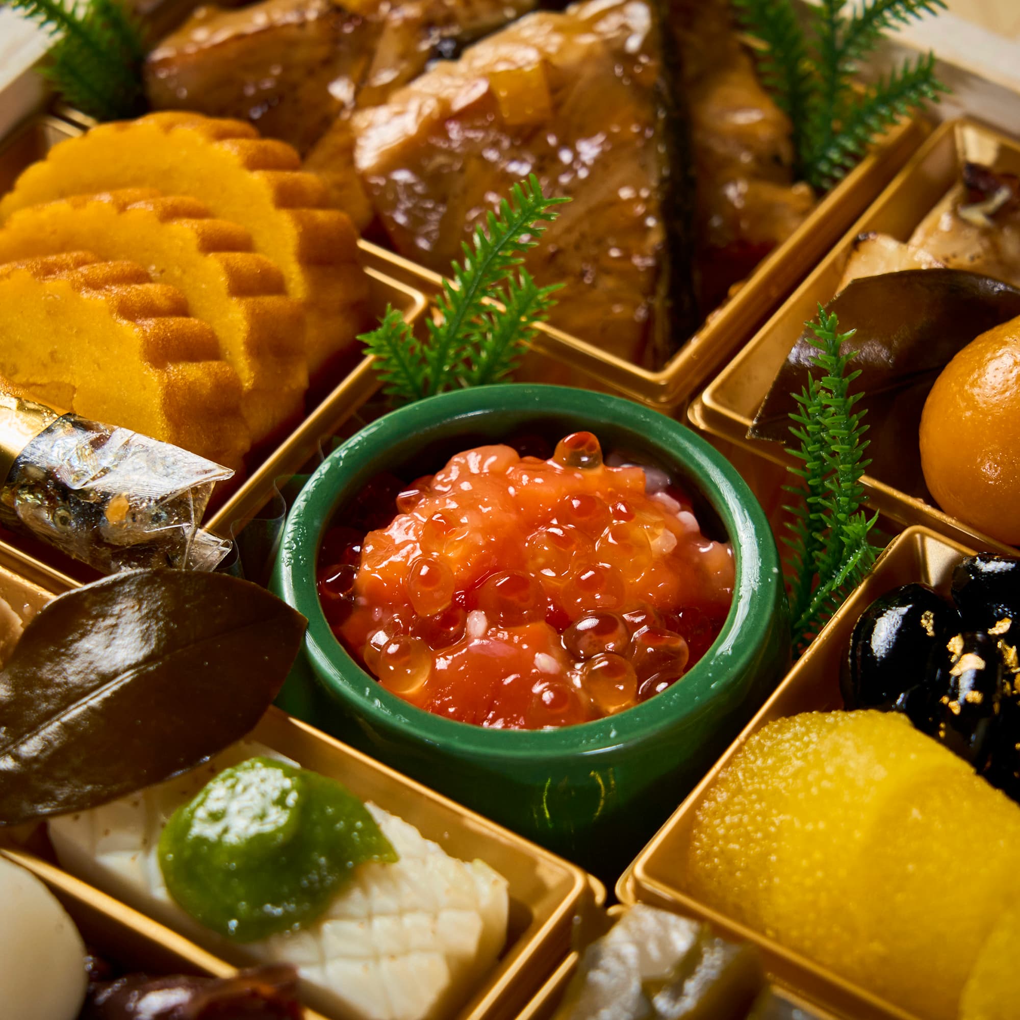鮭ルイベ漬いくら掛け、からすみ、黒豆金箔、網笠柚子、柚子餡餅、さわやか健味鶏の山椒焼、くるみ甘露煮、