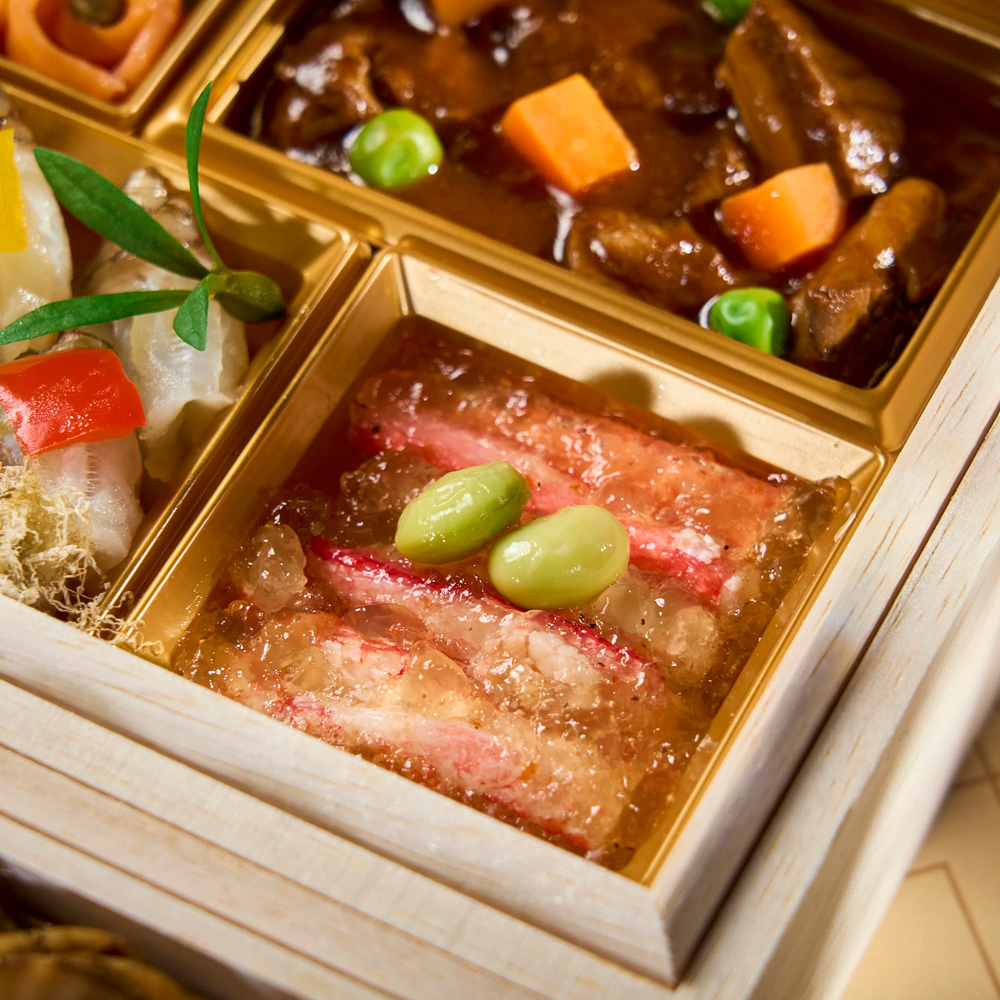 帆立山椒煮、牛八幡巻、鰤の子生姜煮、鰤しぐれ煮、梅麩、子持鮎昆布巻、筍旨煮、味付菜の花、立山ポーク味噌漬、