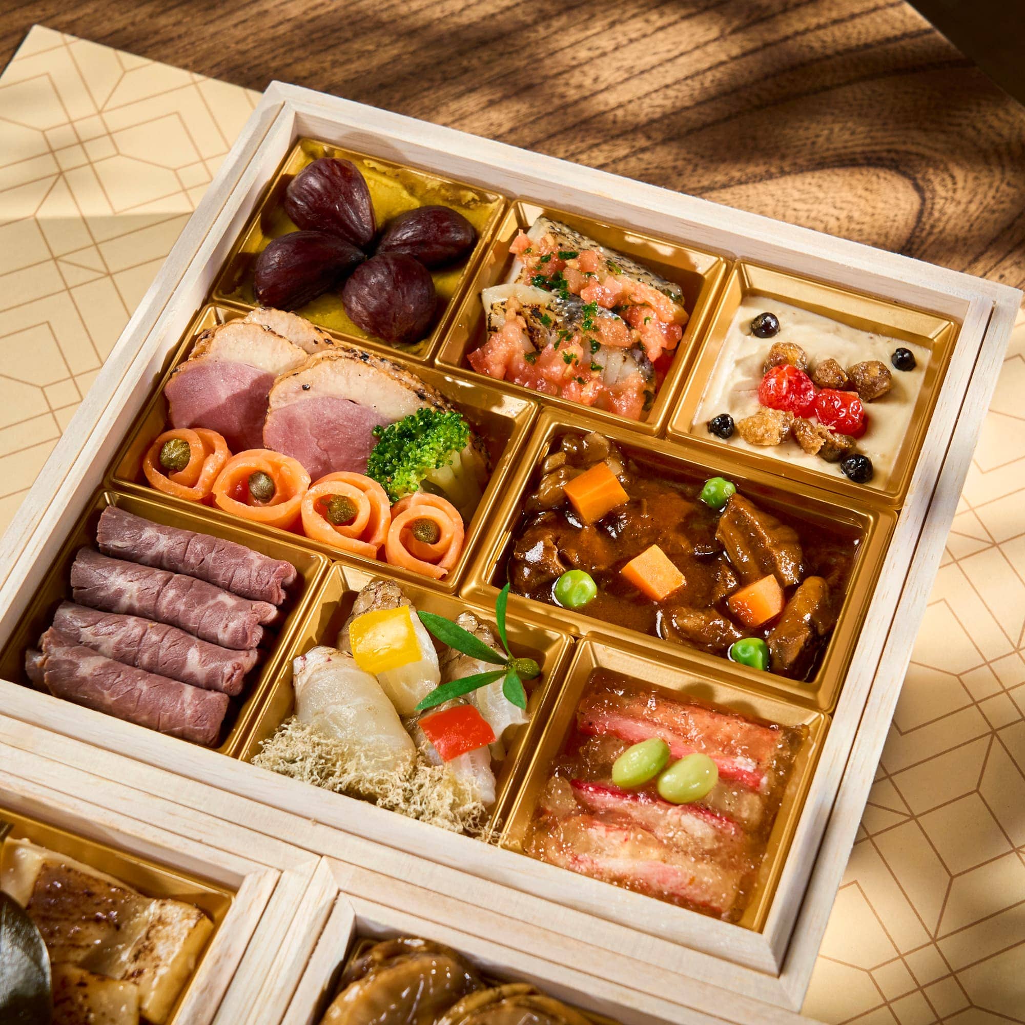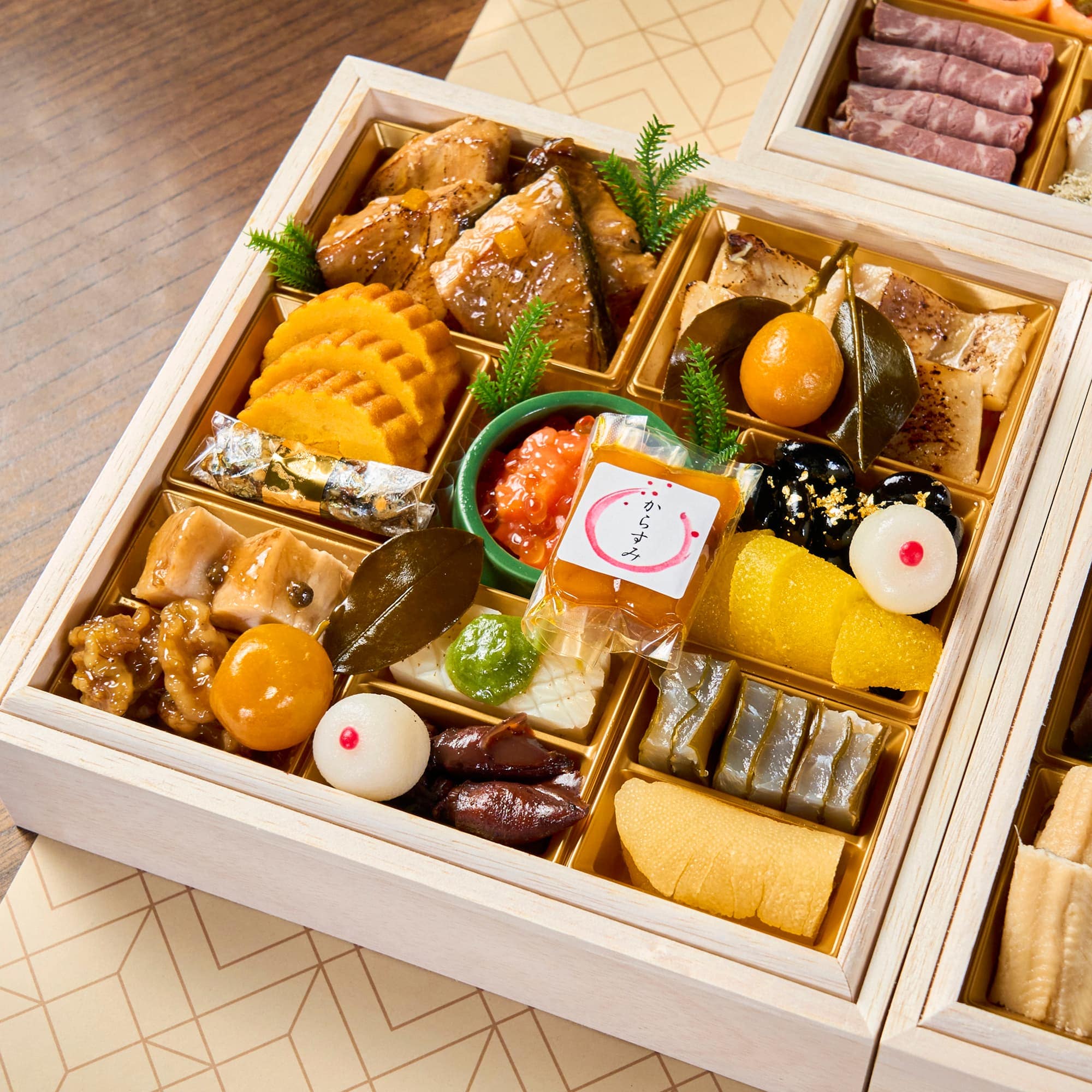 鰤照焼、大根田舎煮、銀鱈西京焼、きんぴらごぼう、葉付き金柑、伊達巻柚子風味、田作りカシューナッツ和え、