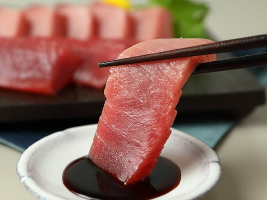まぐろの匠からのアドバイスは、「まぐろをまず半分にしてから、年輪のような筋が入っているところに直角に包丁を当てて切ること。こうすることできれいに刺身にできます。繊維が崩れないようによく切れる包丁を使うのもポイント。トロの部分は赤身より少し薄目にカットし、わさびをやや多めにつけるなど、微妙に食べ方を変えて味を比べるのもおすすめです」とのこと。