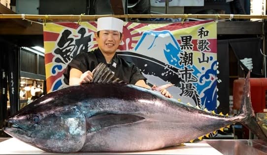 まぐろ解体師として25年。私が在籍している「黒潮市場」は和歌山マリーナシティ内にあります。同シティには、遊園地・ポルトヨーロッパ、釣り公園、紀州黒潮温泉、そしてリゾート気分が満喫できる和歌山マリーナシティホテルが併設され、日帰りでも泊まりでもエンジョイできます。黒潮市場のまぐろ解体ショーは、平日は1日2回、土日祝日は3回行い、さばきたてを刺身や寿司などで提供していますので、それに合わせて来ていただくときっとテンションが上がるはず。お土産も品ぞろえが豊富、ほかにもいろいろなお店で魚介料理を出しています。市場内で好きな食材を選べる浜焼きバーベキューも好評です。