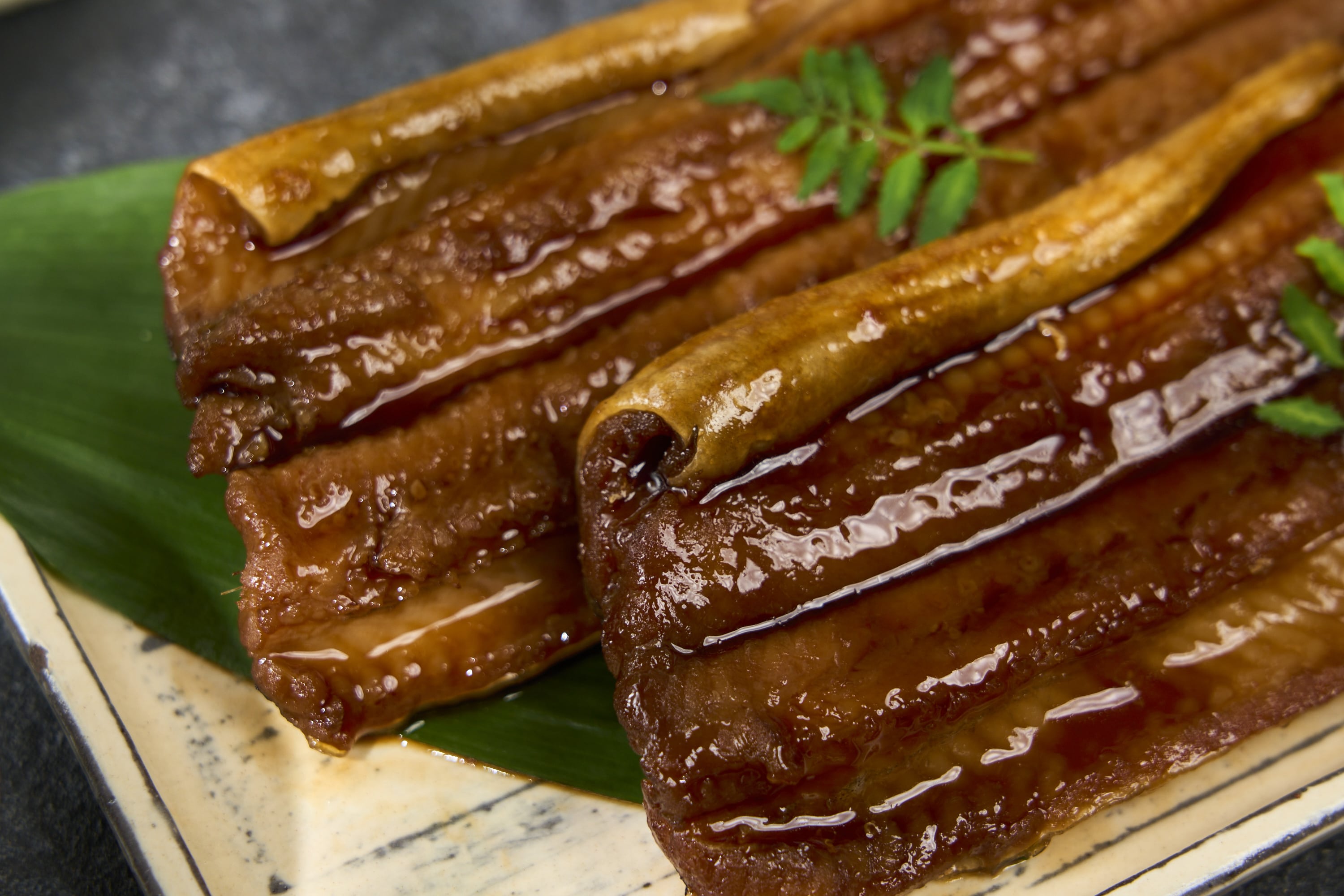 穴子の頭を活用しじっくり時間をかけ煮上げ穴子の出汁を取りタレに加える製法で、深い味わいの絶品のタレを製造し蒲焼、煮穴子に使用しております。