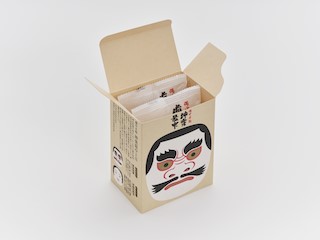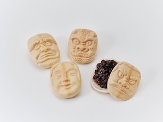 製造開始から約80年、国の重要無形民俗文化財「備中神楽」のお面をモチーフにした最中。