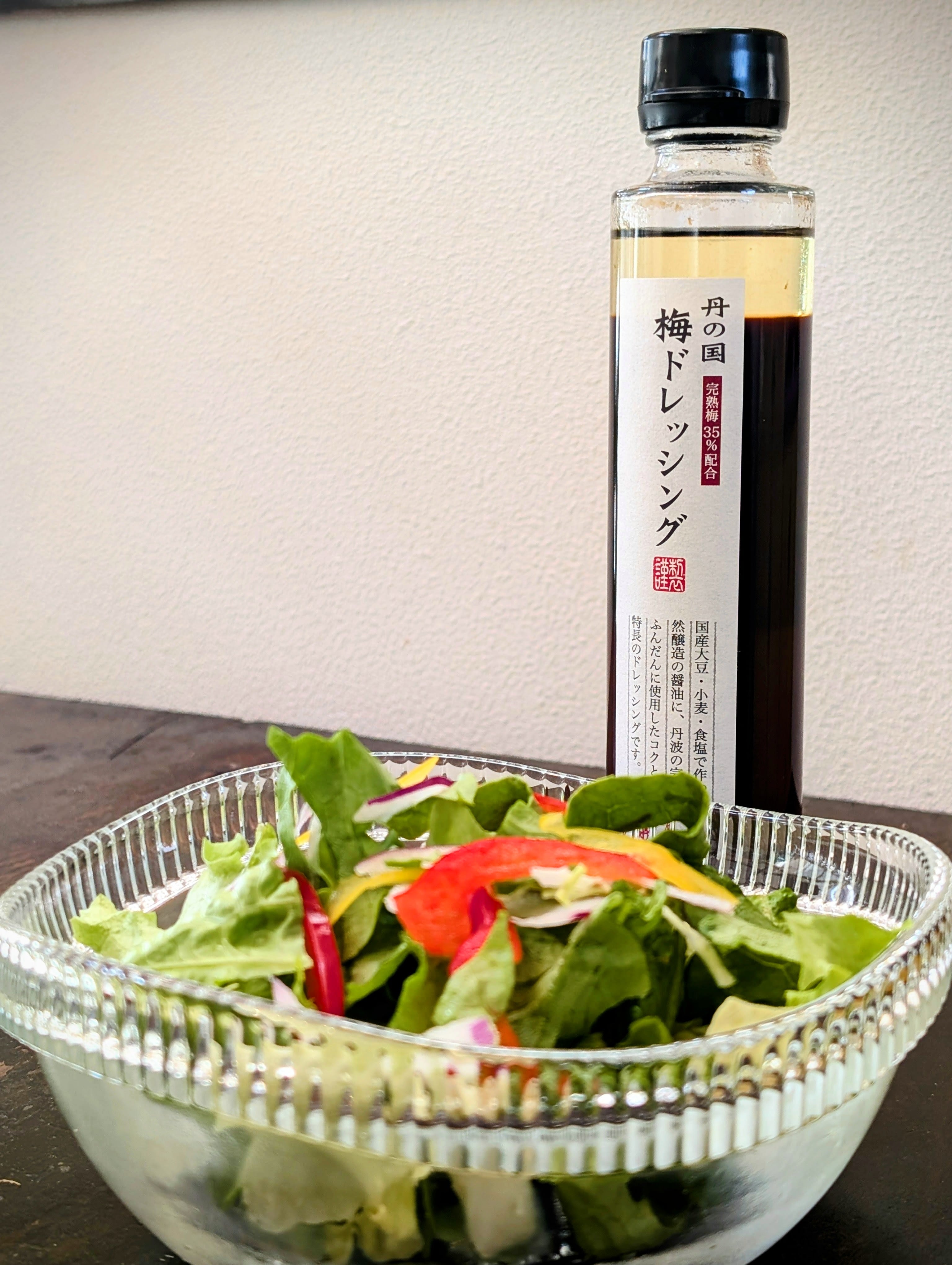 【梅ドレッシング】 しょうゆ(国内製造)、梅ピューレ、砂糖、植物油脂、こんぶだし、(一部に小麦・大豆を含む)