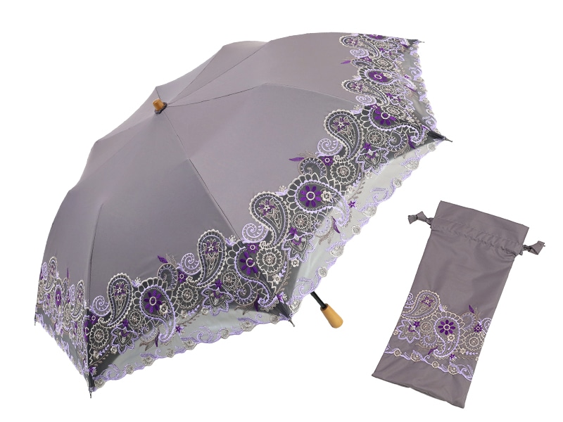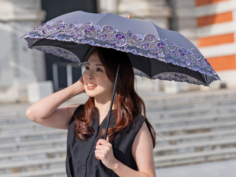 高い技術を用いたオーガンジーカットワーク刺繍で、ペイズリー更紗柄を表現した刺繍が至高の晴雨兼用日傘。