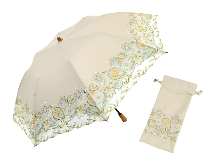 高い技術を用いたオーガンジーカットワーク刺繍で、ペイズリー更紗柄を表現した刺繍が至高の晴雨兼用日傘。