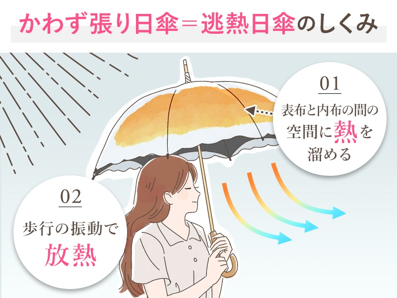 国産高級傘にのみ用いられる「かわず張り」製法を採用し、二重生地の隙間から熱を逃がすことで木陰のような涼しさを実現しました。