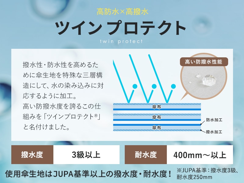 また表布には30回の洗濯試験でも撥水機能が落ちない「耐久撥水生地」を採用。