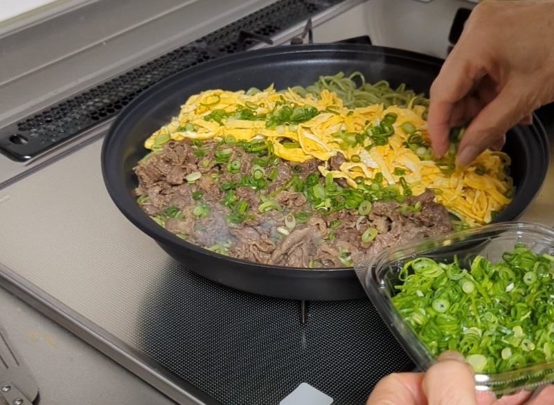 商品には麺とつゆしか入っていないので別に調理しておいた牛肉と錦糸卵を麺の上に載せ、刻みネギと海苔も載せて麺に少し焦げ目が付くまで焼いてください。