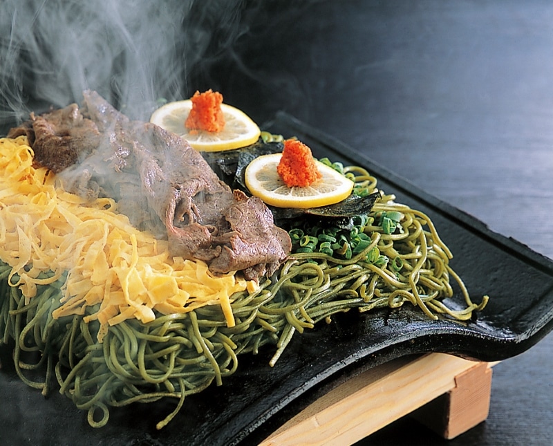 下関の老舗旅館「お多福」の瓦そばは細麺の茶そばが特徴。