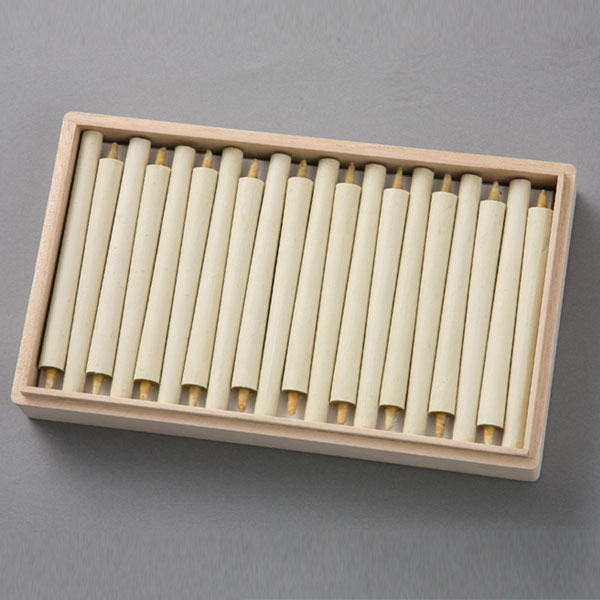 - ろうそく:木蝋、和紙、イグサの髄 箱:桐