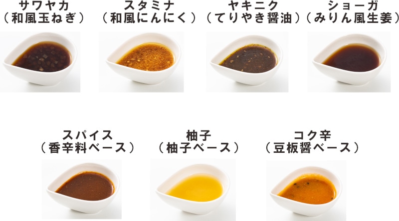 醤油ベースの「サワヤカ」をはじめ、食欲をそそる「スタミナ」、甘めの「ヤキニク」、生姜・スパイス・柚子・こく辛と、既製品を一切使わないこだわりの味が揃っています。ハンバーグだけでなく、ドレッシングや万能ダレとしても使える自慢の逸品。食べ比べやアレンジなど、お好みのスタイルでぜひお楽しみください。