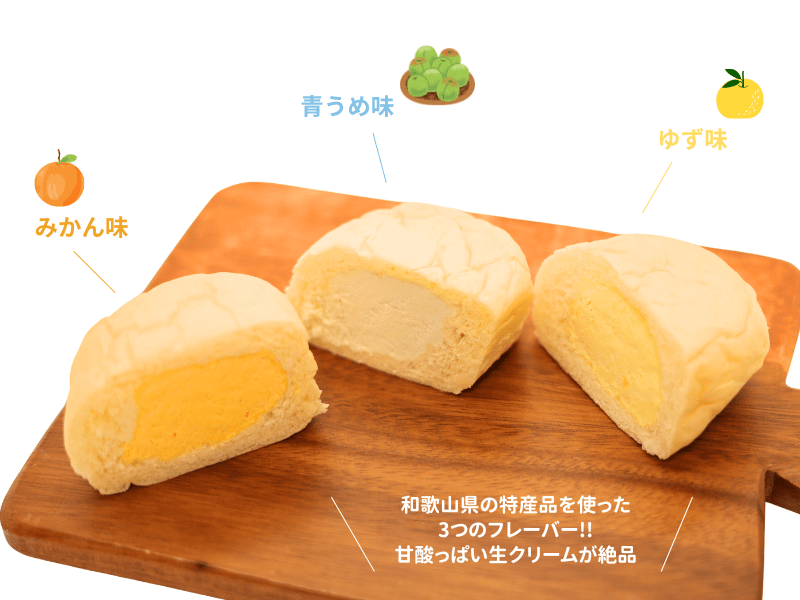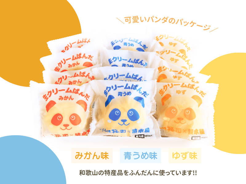 「普通のクリームパンでしょ?」と思ったら大間違い。「生クリームぱんだ」は、1日に2万個を売ると言われる老舗「清水屋」のクリームパンをベースに、和歌山県の名産、みかん・青うめ・ゆずの3種類の生クリームをたっぷり使った特製のクリームパンです。特にみかんとゆずは、独自の加工技術で皮ごとピューレにし、素材の風味をとことん追求。和歌山県で大切に作られる果実の美味しさを余すところなく引き出しています。
