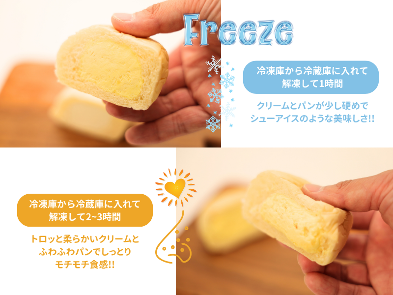 1つずつ個包装されているので、食べたいときに必要な分だけ解凍して楽しめるのもうれしいポイント。常温で解凍もできますが、おすすめなのは冷蔵庫での解凍。約2~3時間で食べ頃になります。少し早く取り出してお召し上がりいただくと、また違ったシューアイスのような食感が味わえます。フルーツを添えてちょっと贅沢なデザートに、さらには解凍後にトースターで表面を焼いて「熱さ」と「冷たさ」を同時に楽しむという上級アレンジも。ぜひ、お好みの食感や食べ方を見つけて楽しんでみてください。