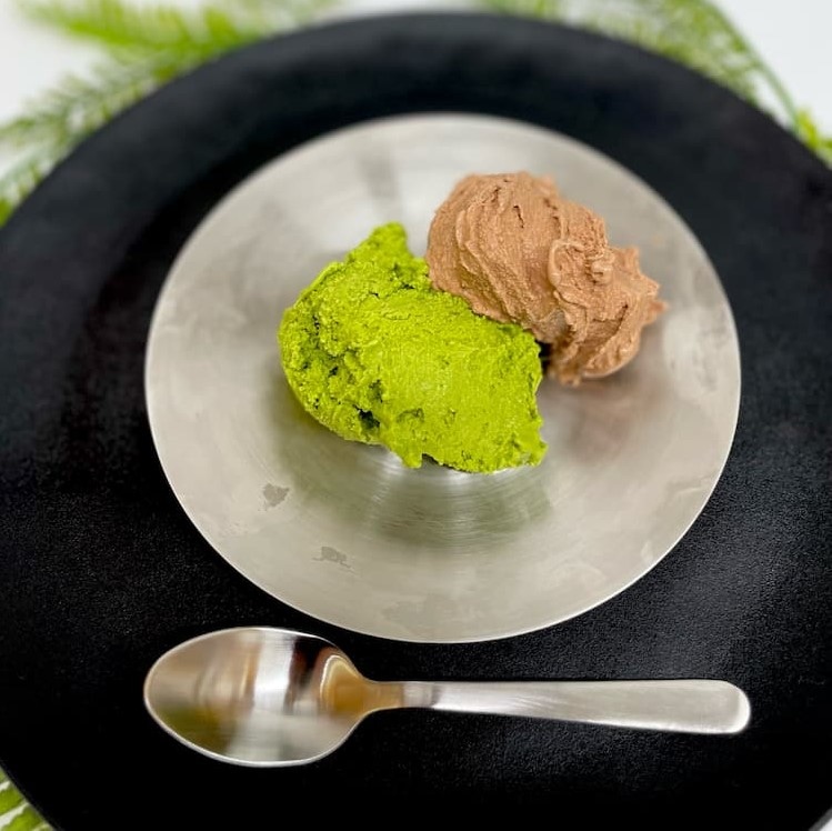 ■「八女茶」…福岡県八女産の緑茶のジェラート。お茶のやさしい甘味と苦味、旨味そして香りを。