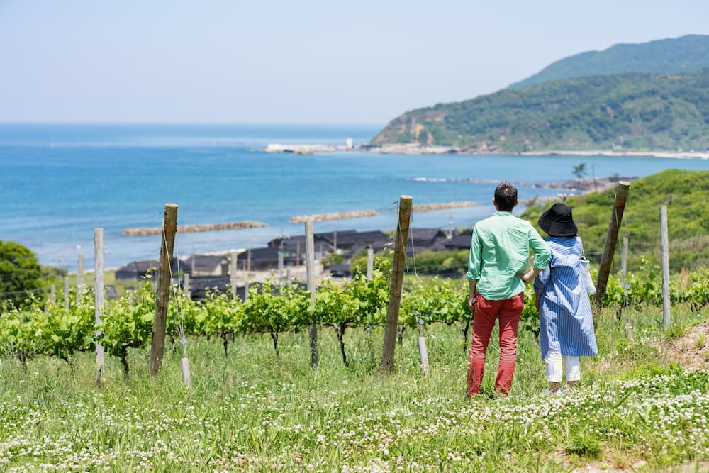 ブドウ畑は、能登半島に位置し、海を見下ろす丘の上にあり、
