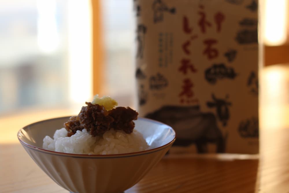 神石牛ならではの濃厚な旨みを生かしたしぐれ煮は、甘辛さの中に奥行きのあるコクが広がる味わいです。