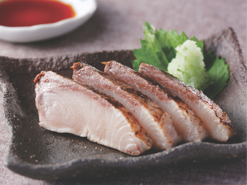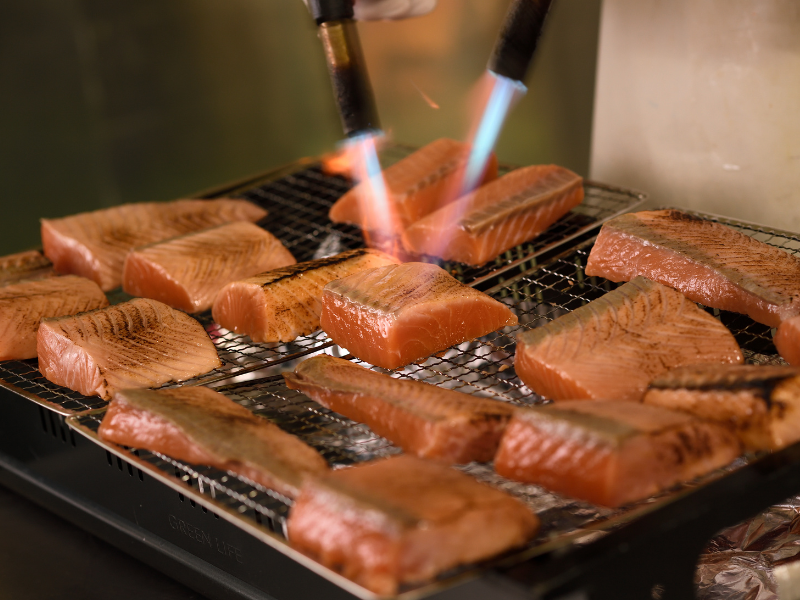 国産の鰤、能登とれのふぐ、ノルウェーまたはチリ産のアトランティックサーモンを特製の塩糀に漬け込んで旨みを引き出した後、高温の炎で炙って仕上げました。