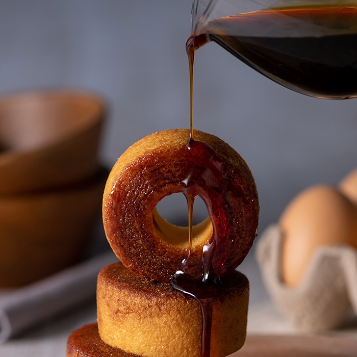 しっとりバームクーヘンにカラメルソースをまとわせ、砂糖をかけてさらに焼き上げました。