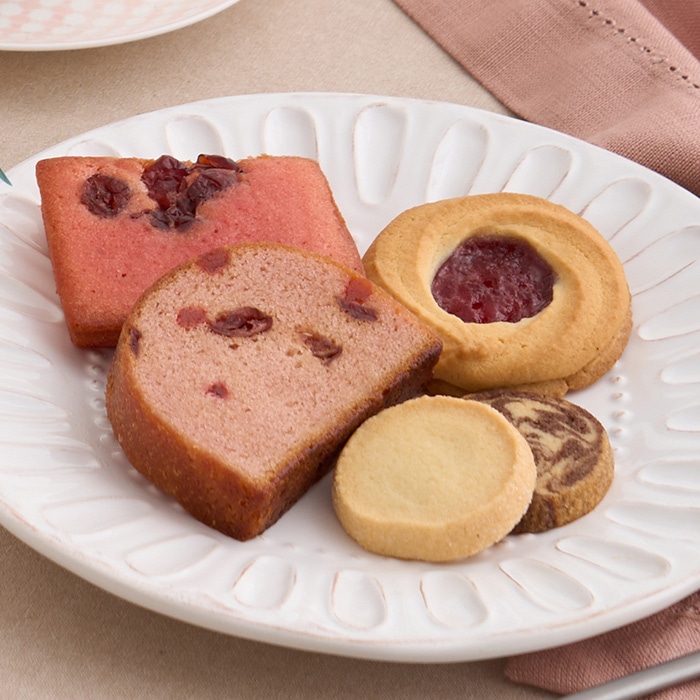 甘酸っぱいフランボワーズのプチケーキ、ベリーの甘い香りのパウンドケーキ、ジャムの酸味と甘いクッキーがマッチするブルーベリージャムのクッキー、素朴な味わいのひとくちクッキーを詰め合わせた焼菓子アソートとカーネーションをセットでお届けします。