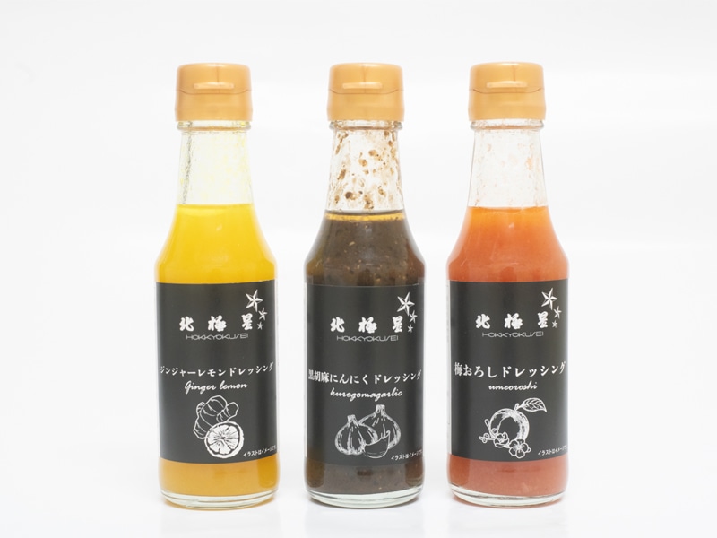 健康志向が高まっている現代では食生活で野菜は日々の食事に欠かせないものだからこそ、素材の味を楽しめるドレッシング、黒胡麻にんにく、ジンジャーレモン、梅おろしの3種が完成しました。