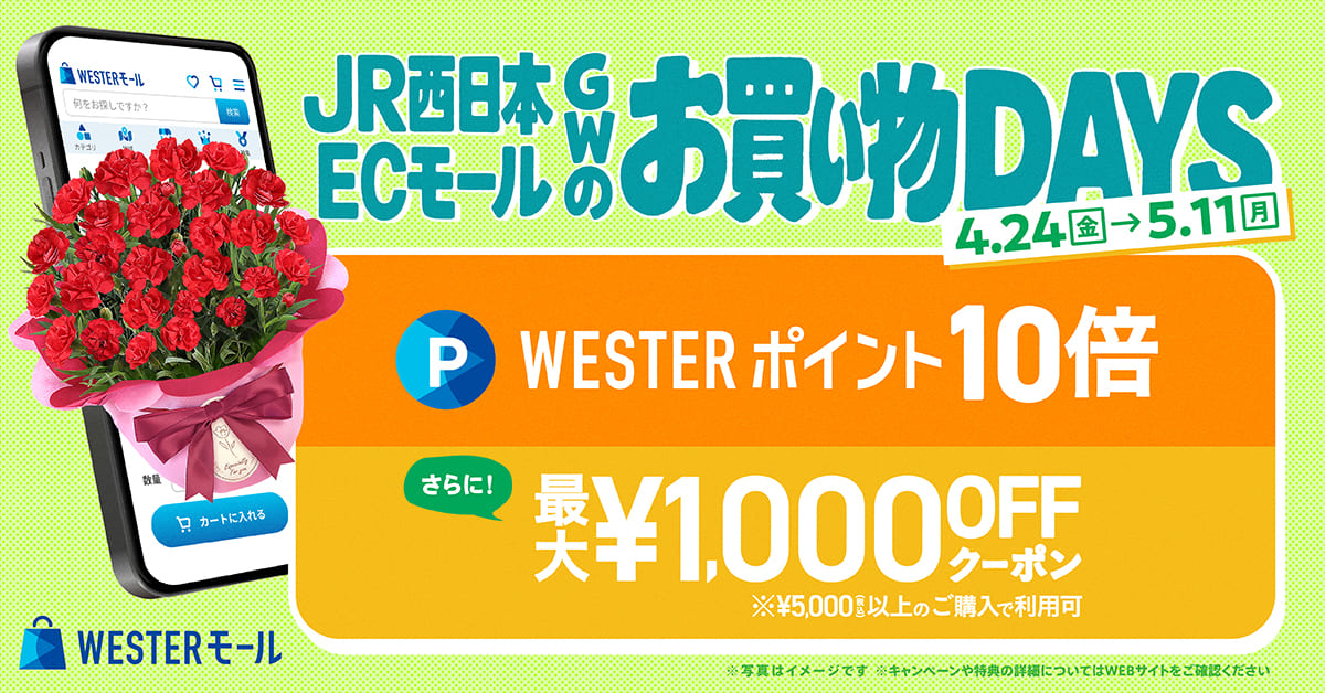 キャンペーン期間中は、1注文ごとの商品合計額110円(税込)につきWESTERポイント(基本)が1ポイントたまり、さらに通常ポイントの9倍分のWESTERポイント(基本)が付与され、合計で10倍のWESTERポイント(基本)がたまります。