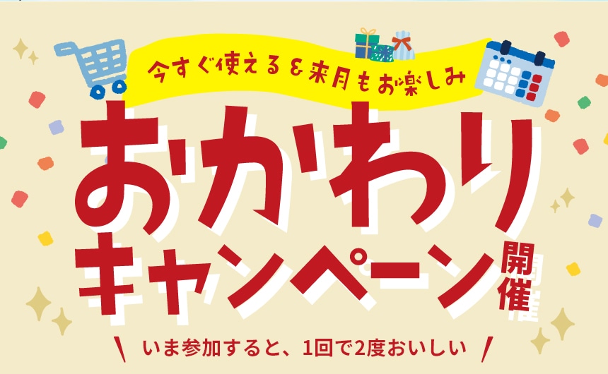 まずはコード「okawari2602」で、今すぐおトクにお買い物。2月のクーポンをご利用いただいたあなたの元に3月にご利用いただける「おかわりクーポン」が届きます。