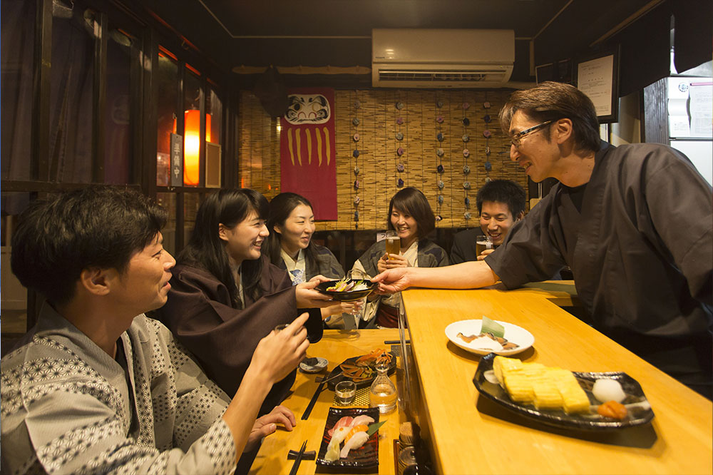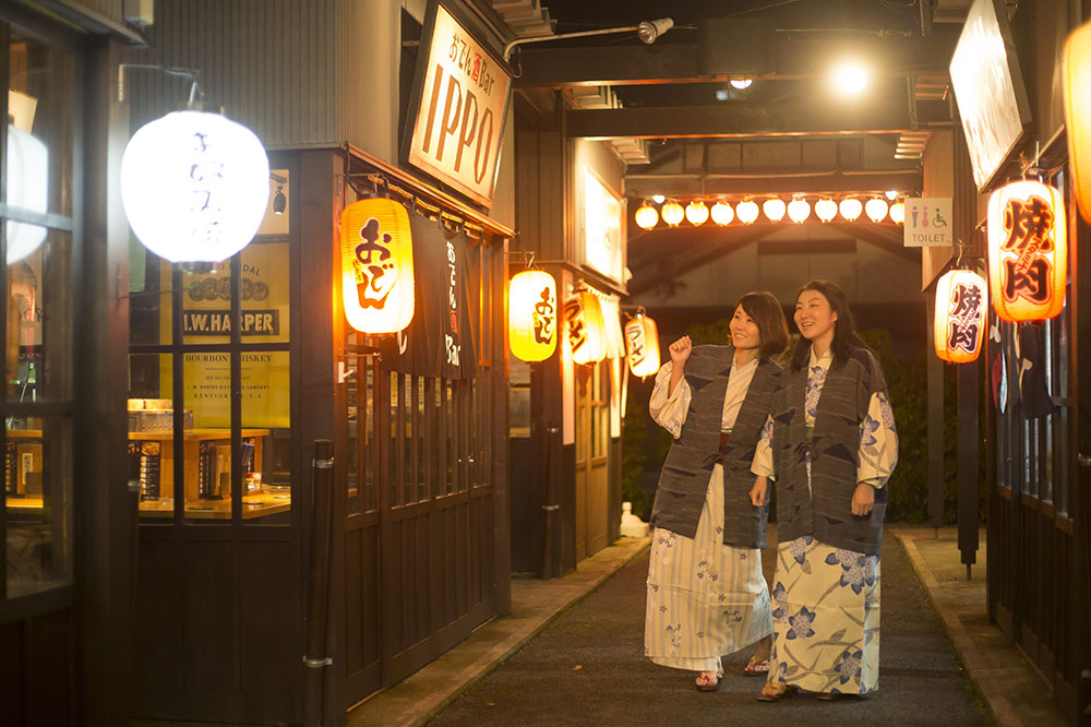 あわら温泉は、エリア随一の温泉街。同地の玄関口でもある「あわら湯のまち駅」前の広場には、無料の足湯が5つ。併設している湯けむり横丁は地産地消をテーマにした屋台村で、夜にはお酒を傾けながら地元の人との交流が楽しめます。