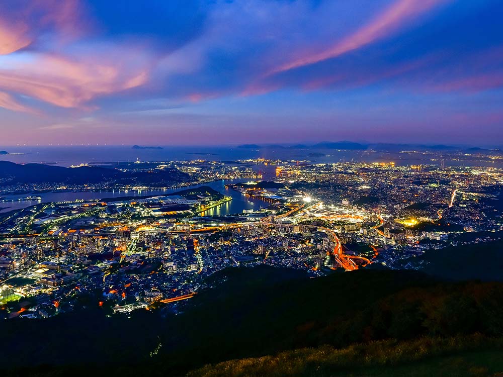 北九州市は、全国約6,600名の夜景観光士による投票で「日本新三大夜景都市」に選ばれ、連続してトップ都市にもなったほど夜景の美しさで知られています。100億ドルの夜景ともいわれる「皿倉山」や、響灘までのパノラマが見事な「高塔山公園」からは小倉市街が一望のもと。ほかにも、芝生に座ってのんびり景色を楽しめる「足立公園」、門司港レトロ側から関門海峡を望む「和布刈(めかり)公園」など11もの「日本夜景遺産」があります。