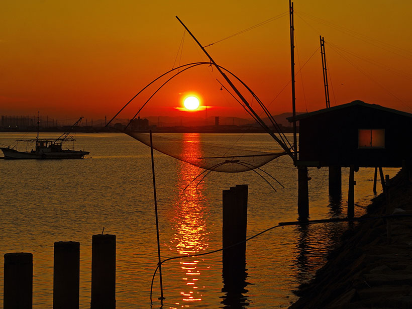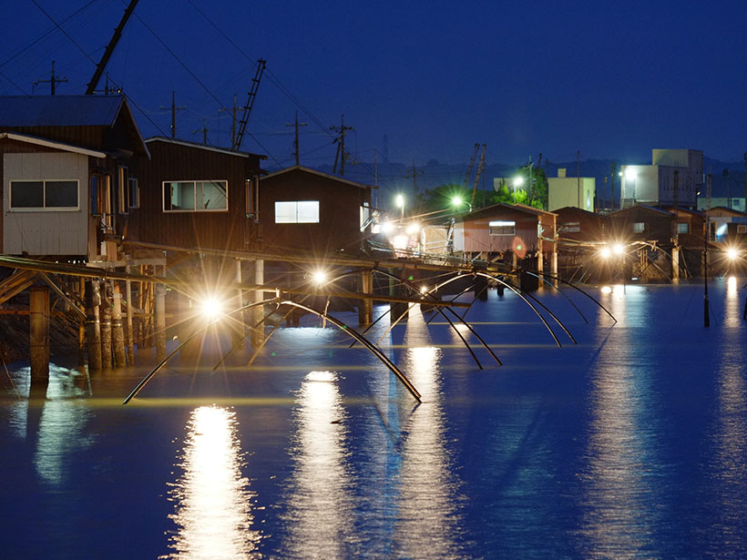 釣り好きは、岡山市児島湾の防潮堤で行われる伝統漁法「四つ手網漁」に注目。小屋の中から大きな網を沈め、そこに集まった魚をすくい上げるだけの駆け引きいらずの釣りです。獲れた魚は小屋内で調理しておいしくいただけます。