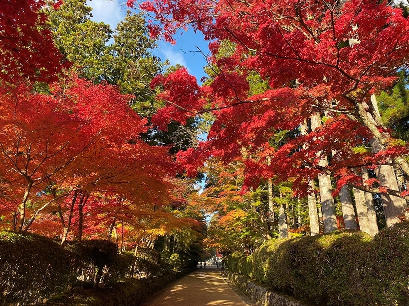 特に奥之院へは、20万基超の墓石が並び樹齢数百年をこえる大杉が連なる参道を進み、入口にかかる御廟(ごびょう)橋を渡った瞬間、静寂に包まれた世界が広がります。奥之院の御廟では、今も弘法大師空海が瞑想を続けているため、毎朝6時と10時半の2回、弘法大師空海に食事を届ける「生身供(しょうじんぐ)」が1200年以上続けられています。こんな荘厳な儀式を目にできるのは貴重な経験。ぜひ早起きして参拝を。