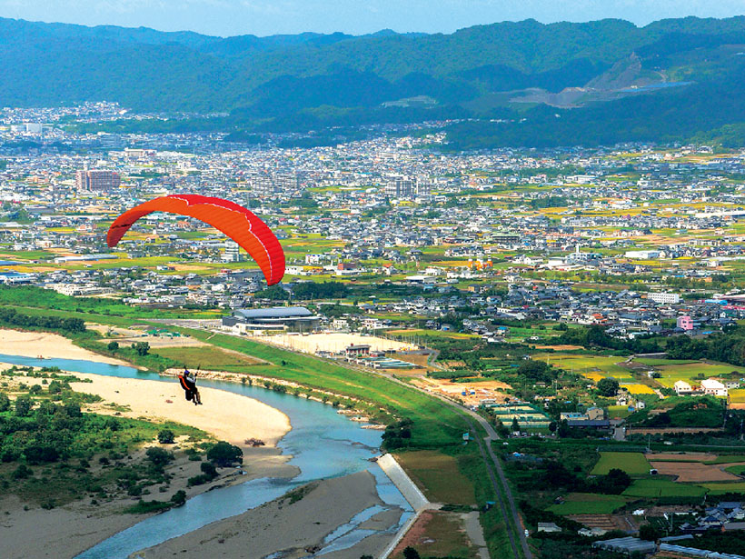 「高野山・紀の川」エリアはサイクリング以外にも里山の自然を楽しめるアクティビティが充実。とくに「パラグライダー」は、市街地から近いにもかかわらず、広い河川敷と山、川、海からの風が一年中吹くという全国でもめずらしい絶好のロケーションのため、競技選手や愛好家の間では聖地と呼ばれているそう。タンデム飛行による初心者の体験プランもあるので、自転車の次は空にテイクオフを。