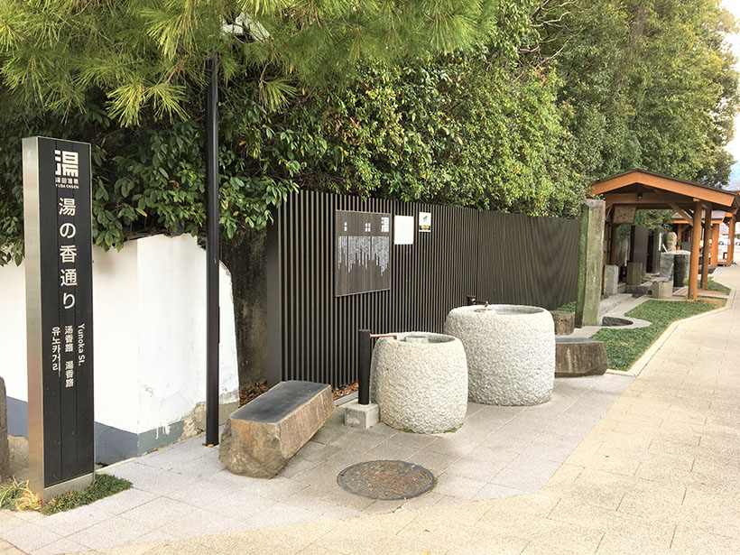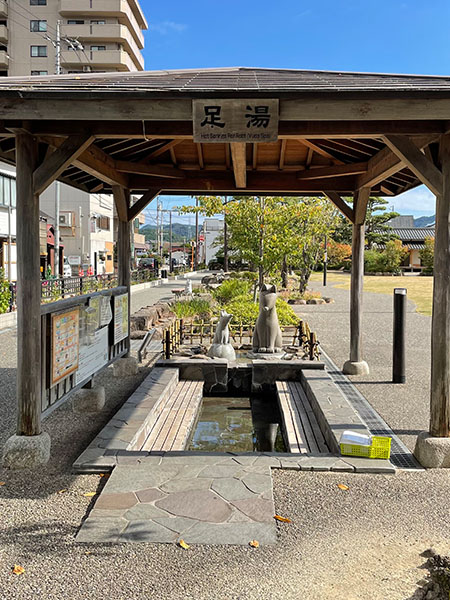 足湯は温泉内に計7カ所。駅前の足湯では、湯に浸かりながら「SLやまぐち」号の迫力ある姿が間近に見られます。