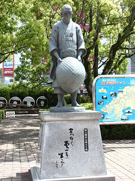 湯田温泉といえばもうひとり、通りに名を残す漂泊の俳人・種田山頭火。温泉好きの山頭火は湯田温泉をとくに気に入り、一時期居を構えて句作を続けながら、酒と湯を楽しみました。中原中也の生家にも出入りし、弟たちと親交を深めていたとか。湯田温泉を詠んだ多くの句のなかでも錦川通りの句碑に刻まれた俳句は、山頭火らしく実に自由でユーモラス。ここでは紹介できませんので、お見逃しなく!
